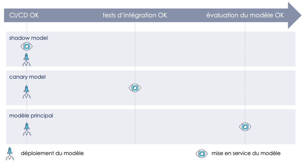 L’endroit le plus pertinent pour mesurer ces indicateurs, est la production. Il nous faut donc sortir de l’impasse que nous évoquions plus haut. Pour cela, nous vous proposons de revoir la chronologie du processus de validation de nos modèles, afin de découpler le déploiement de la mise en service, et donc être en capacité de mettre en production sans impacter notre utilisateur. Voici un exemple nous permettant de le faire.