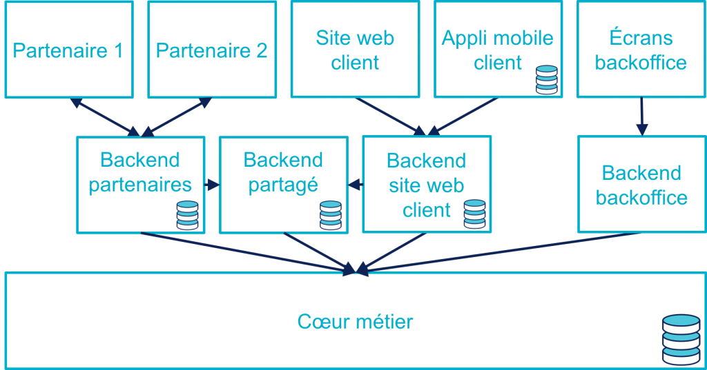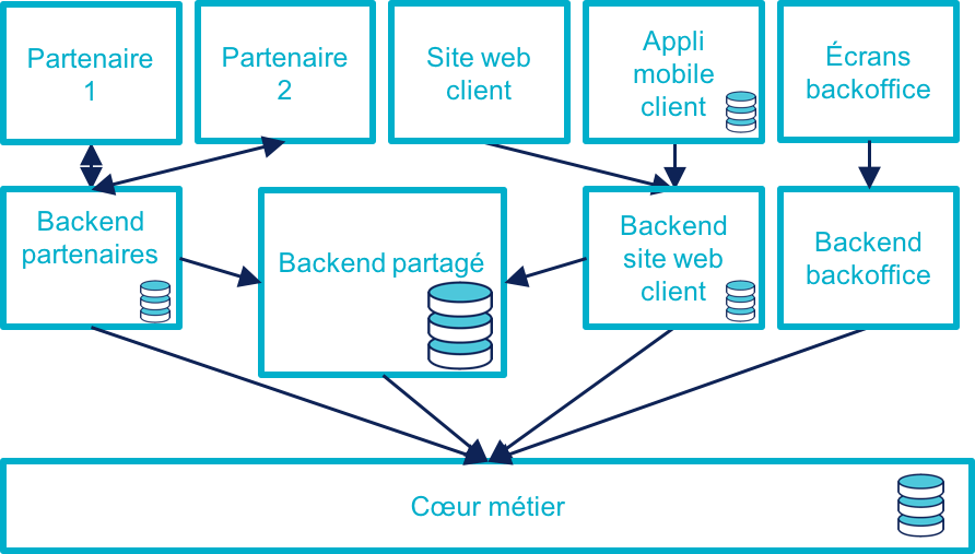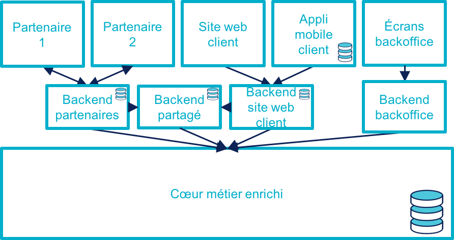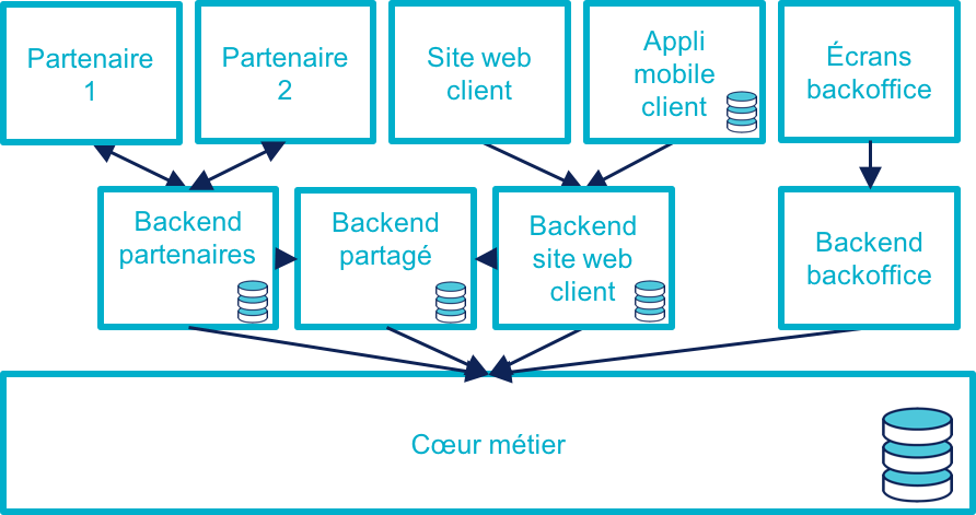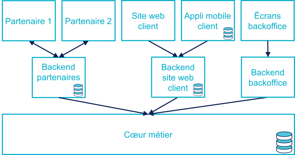 Ainsi vous n’exposerez pas forcément les mêmes services ou les mêmes technologies pour votre application mobiles et pour vos partenaires. Vous aurez un système cœur sur lequel viendront se greffer votre canal backoffice, votre canal public, votre canal partenaire…
