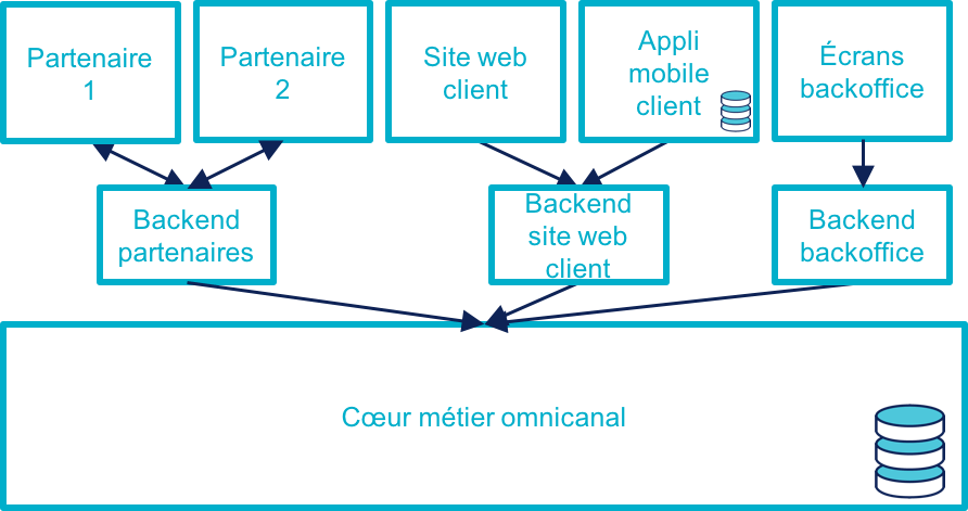Les process nécessaires aux partenaires sont aussi différents du process historique que du process web, le système devient donc souvent tricanal. Prenons le cas où l’intégration se fait via un backend spécifique.
