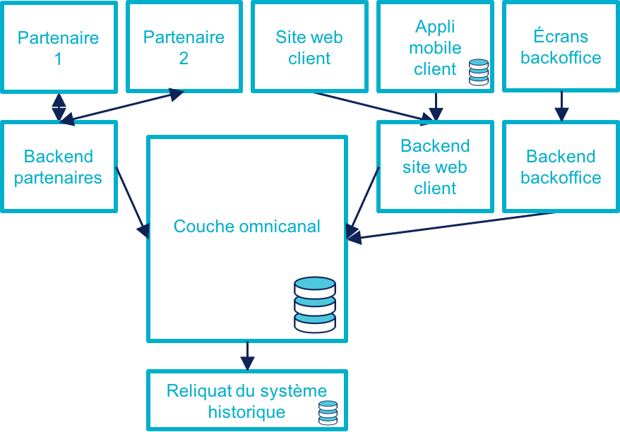Pour rester lisible, le schéma ne contient pas les backoffice dédiés aux canaux web et partenaires mais ils existent bel et bien, une personne du support peut donc avoir à jongler avec trois backoffices différents.