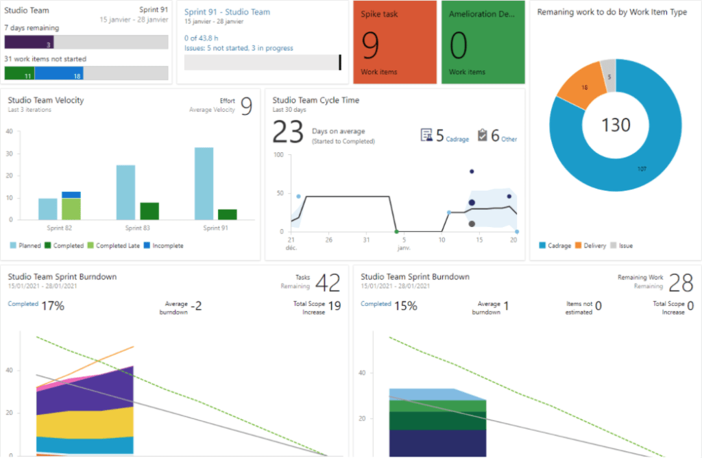 Dev.azure : Pour la gestion de notre organisation quotidienne et le calcul de nos metrics. Il nous permet de gérer nos sprints au quotidien sous forme de kanban, d’alimenter notre backlog, et de gérer notre CAF et calculer notre performance.