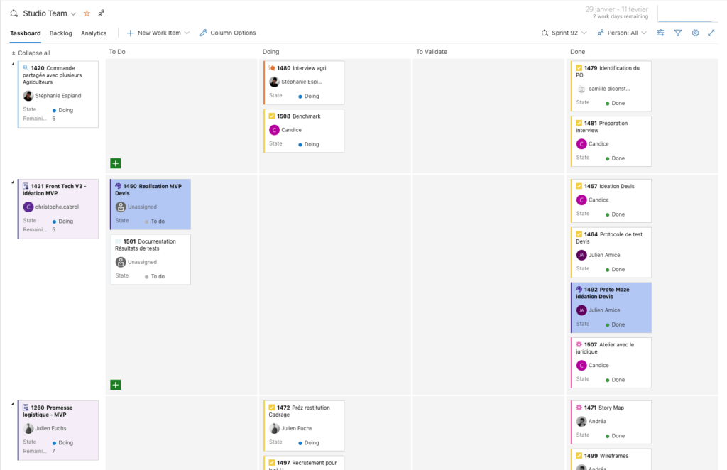 Un board design construit en EPIC et tâches associées (UX, UI, User Research) qui nous donne le cap à suivre et la progression des designers sur les 2 semaines.
