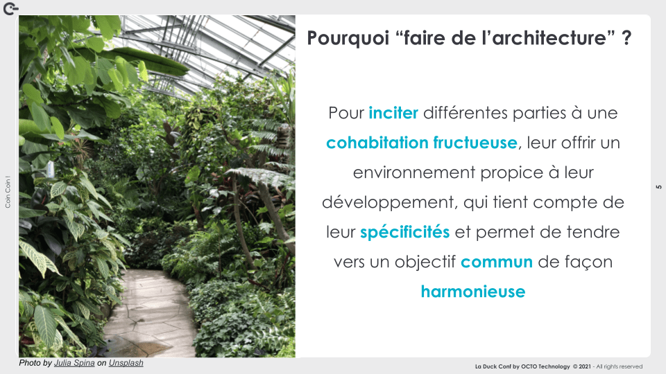 Un architecte est comme un jardinier : il compose un système dans lequel vivre en harmonie et former un tout, pour évoluer vers un objectif commun.