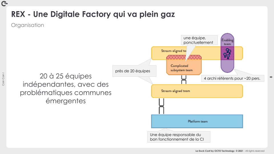 - Une équipe transverse "goal volant" ("enabling team") : c'est ici que sont les architectes. On compte 4 architectes pour une équipe d’environ 20 personnes aux expertises multiples : UX, sécurité, agile, etc. Très mobile, elle interagit régulièrement avec les autres équipes.