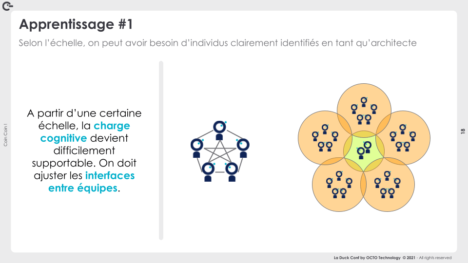 - Apprentissage #1 : avec l'agrandissement d’échelle, on a besoin d'individus clairement identifiés. La charge mentale nécessaire associée passe mal l'échelle : les échanges doivent être plus structurés.