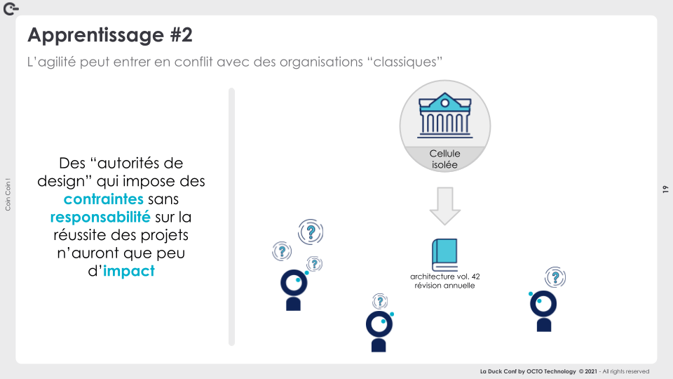 - Apprentissage #2 : l'agilité peut entrer en conflit avec des organisations classiques. La cellule "isolée", très "descendante", n'a que peu de chances d'être efficace. Les équipes d'architectes doivent se rendre compte des impacts des décisions et des retours des équipes de développement. Il vaut mieux susciter l’intérêt plutôt que d’imposer la contrainte (anti-pattern : “authority without responsibility").