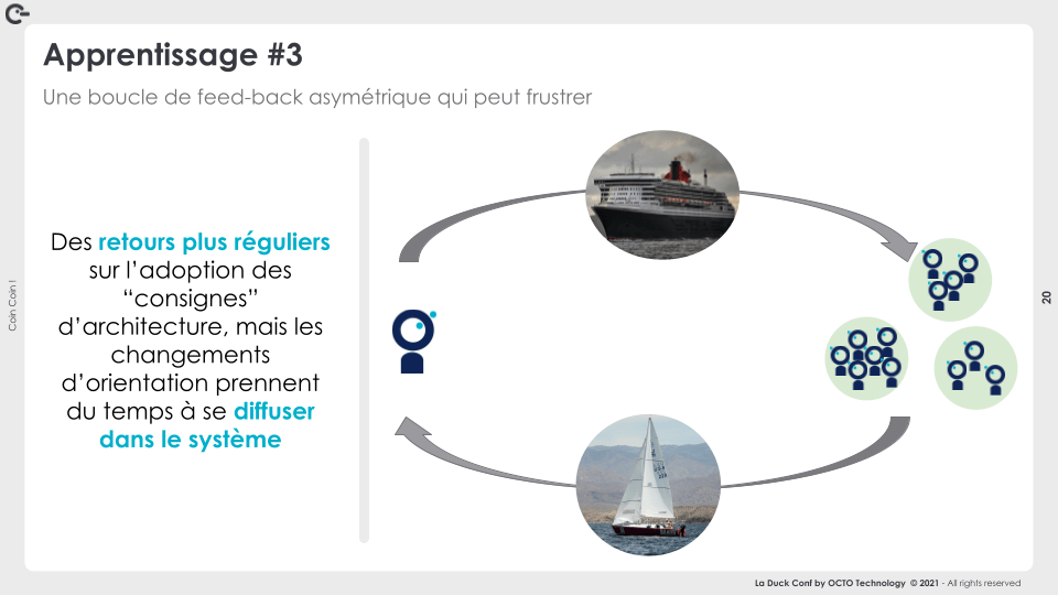 - Apprentissage #3 : la boucle de feedback asymétrique peut être frustrante pour les architectes. L'agile permet des retours réguliers qui permettent de se rendre compte rapidement des impacts, mais lorsqu'il faut changer de direction, cela peut être plus compliqué et prendre davantage de de temps sur les décisions d'architecture faites en centrale. Attention à la frustration de n'avoir qu'une moitié de la boucle de feedback qui s'accélère !
