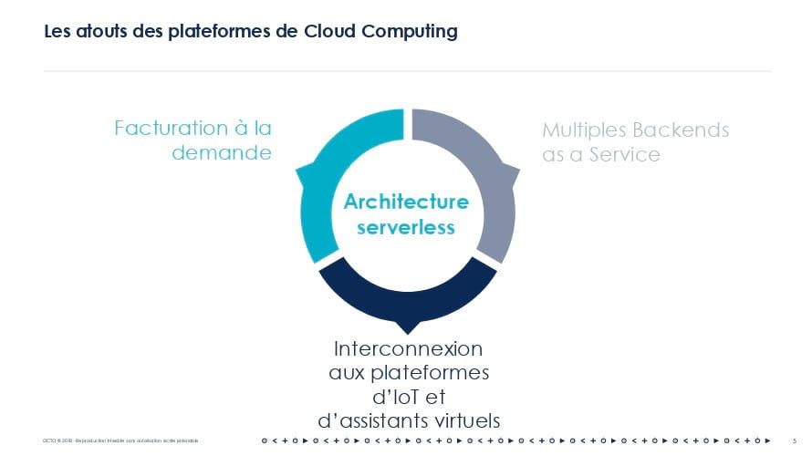 Depuis plusieurs années déjà, le concept d'IoT est sur le devant de la scène. Depuis 3 ans, le marché a émergé et des premiers exemples concrets sont là. Paris Aéroport modélise le comportement des passagers dans les terminaux grâce aux caméras de surveillance dans le projet Vasco. CMA-CGM a équipé ses conteneurs  de capteurs. De plus en plus d'objets du quotidien deviennent connectés (ampoules, thermostats, ...). Les assistants vocaux virtuels ont déferlé dans les foyers à l'occasion des fêtes de fin d'année. D’un point de vue du système d'information ce sont tous des objets connectés. Ils vont permettre toujours plus d'interactions avec les utilisateurs ce qui est une bonne chose. Mais ils demanderont au SI encore plus de disponibilité, de scalabilité et de richesse que les applications mobiles et les portails web. Nous sommes convaincus qu’il faut être préparé à ces nouveaux enjeux. Notre meilleure chance réside dans les opportunités liées aux nouvelles technologies qui les accompagnent. Les plateformes cloud, et les plateformes serverless dans une forme plus avancée, sont ainsi à nos yeux indissociables des objets connectés et des assistants virtuels. Elles sont, en effet, un remarquable atout pour répondre aux nouveaux enjeux qui leur sont associés.
