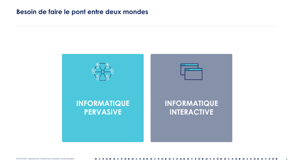 Ces solutions sont interconnectées comme nous l'avons vu avec la plateforme mais également avec le Système d'Information de l'entreprise et l'existant. Il s'agit de leur quatrième besoin : faire le pont entre deux mondes : celui de l'informatique pervasive (omniprésente en français) et l'informatique traditionnelle. Je nommerais cette-dernière informatique interactive ou transactionnelle (au sens de l’ancien terme Transactional Processing).