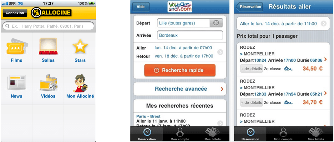 Et des exemples comme celui là, il y en a plein d’autres. Je pense par exemple à Allociné (mais aussi Fnac.com, Amazon.com…), sobre, directe, dépouillée et se concentrant pour l’essentiel sur ce que cherche un utilisateur en premier. Une salle et/ou un film. Autre exemple illustre : Voyages Sncf. Là aussi l’appli mobile est dépouillée et directe ; allez ensuite faire un tour sur le site web, c’est le jour et la nuit. Voici leurs versions mobiles.