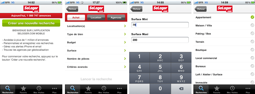 Ensuite, en prenant l’exemple de l’application SeLoger.com, qui nécessite de saisir une liste de champs très nombreux et qui tout bonnement ne tiendraient pas sur un écran de mobile, des parades astucieuses ont été trouvées. D’abord, le menu principal est simple : en 3 boutons. « Achat » ; « Location » « Agence ». Puis une liste de sous menus me permet de renseigner des informations basiques (ville, code postal, surfaces, prix min max…). Sur chacun d’entre eux, je dois ainsi saisir une ou 2 infos maximum, un clavier m’étant proposé systématiquement, ou simplement cocher des items.