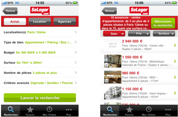 Au final, j’ai rempli autant d’information dans cette appli IPhone que sur le site web sauf que l’agencement et les interactions m’ont rendu la tache ultra simple et plus claire que sur le site web (surtout par rapport à leur ancienne version qui depuis s’est amélioré en profitant peut être de leur expérience sur terminal mobile), amusant non ? Et pour le rendu du résultat c’est pareil : je n’avais que les informations essentielles : prix, code postal, surface, descriptif ultra court, mini photo. Pour le détail je clique. Bref je pourrais le faire sans problème en environnement « hostile » comme sur un chantier entouré d’une grue et d’un tractopelle, dans une rue bruyante ou serré dans le métro.