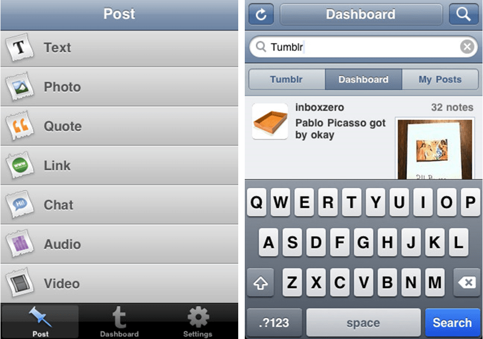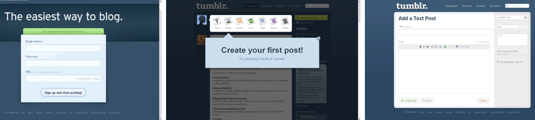 Je pense que cela pourrait efficacement bénéficier aux applications non IPhone, même si les écrans font 30 pouces de diagonales. Utiliser ces mêmes contraintes pour penser les applications pour le poste de travail, ou web finalement, ça pourrait être bénéfique. Prenez par exemple : http://www.tumblr.com/, site de blogs récompensé justement pour ce côté ultra simple, dépouillé et concentré sur son cœur de métier. Tout porte à croire que justement ils ont fait cette démarche en l’appliquant à leur site web. Leur mise en page et mise en ligne (blog) sont réduites à leur plus simple expression. Et pourtant c’est ultra efficace. De plus on peut bien entendu poster ou consulter depuis son mobile (l’IPhone ici). Voici la page d’accueil du site web ainsi que des exemples de pages pour poster :