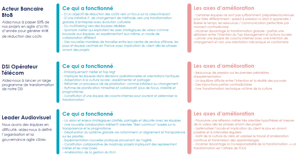 Avec notre acteur bancaire, qui a lancé une initiative méthodologique IT portée par l’IT, nous avons initié un questionnement autour du sens et du leadership de cette ambition de changement : une invitation à sortir d’un discours de méthode pour aller chercher un moteur plus inclusif qui sert le bien commun et le travailler mieux ensemble : ”En arrivant dans votre organisation, on observe des gens qui font bien, voire très bien leur travail - en quoi l’agile serait une réponse au sens de votre transformation ? Est-ce un véritable moteur motivant au changement ? Quelle est donc la question centrale de votre transformation ?”