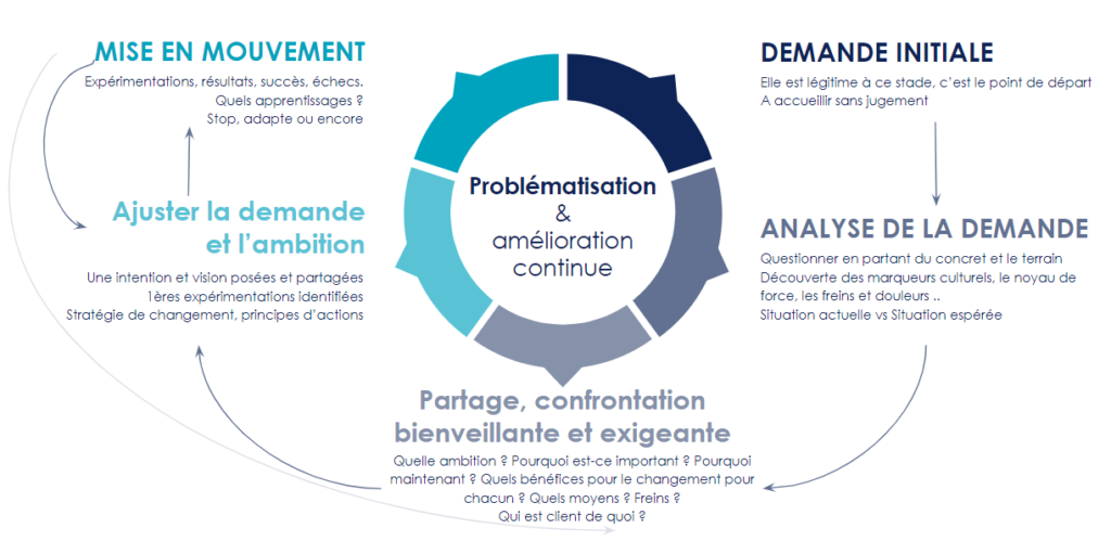 L’intention de ce questionnement est d’éviter le piège de la solution prête à porter. C’est précisément cet exercice de problématisation permanent qui vous indiquera petit à petit le chemin à emprunter pour atteindre les ambitions de votre transformation.