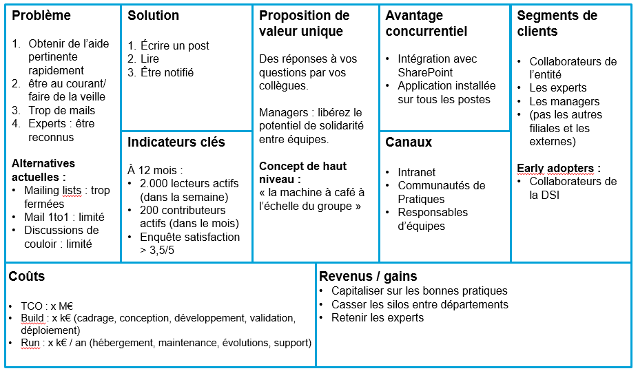 Voici la case segments client pour un projet de RSE, Réseau Social d’Entreprise. Cet exemple montre que le Lean Startup peut s’appliquer dans un contexte de grande entreprise, pour des projets clients mais aussi des projets internes.