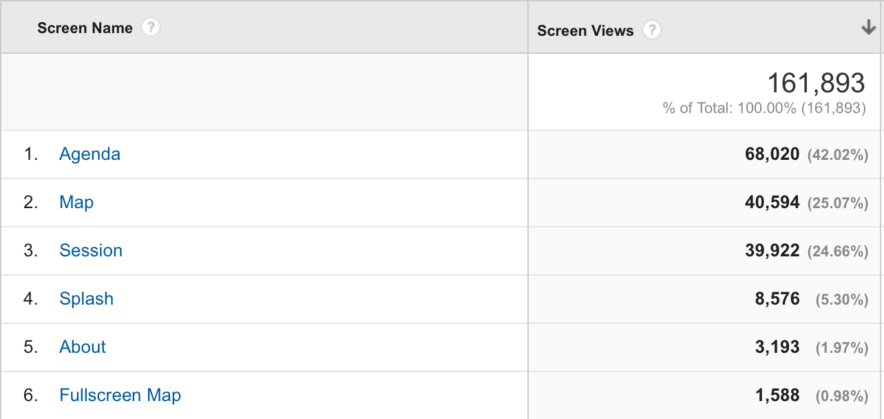 Pendant la conférence, 1 303 utilisateurs uniques ont ouvert l'application, générant 13 299 sessions et 161 893 écrans affichés. Cela représente 85% des 1500 participants. Plutôt beaucoup, non?
