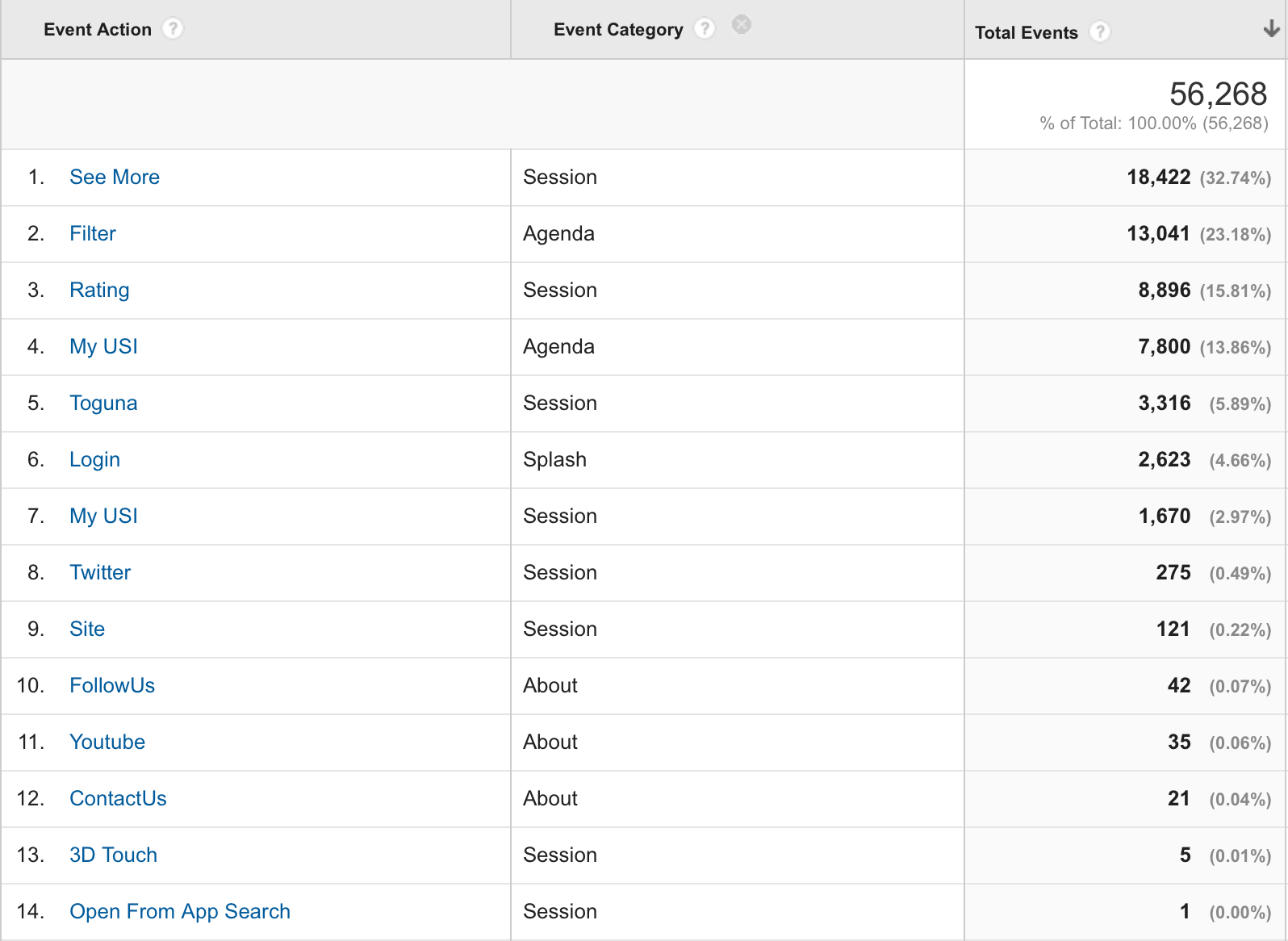 Sans surprise, l'agenda est de loin l'écran le plus vu, devant les écrans Plan et Session. Les écrans A propos et Plan plein écran représentent moins de 3% de la navigation globale. Comme les boutons de souscriptions aux réseaux sociaux (Twitter, mail and YouTube) n'étaient disponibles que sur l'écran A propos, ces fonctionnalités n'ont pas été que très peu utilisées, comme on peut le voir sur le tableau précédent.