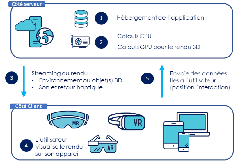 - 5 : Le terminal client renvoie au serveur la position ou l’action de l’utilisateur afin de mettre à jour l’expérience ou l’état de l’application (on reboucle ensuite à l’étape 2)