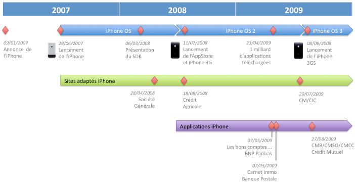 Ainsi les banques ont développé des sites Web spécifiquement pour l'iPhone (Société Générale en Avril 2008, Crédit Agricole en Juillet de la même année) qui ont chacun fait l'objet d'un grand nombre d'articles élogieux sur le Web à une période où le secteur bancaire n'avait pas les grâces du public.