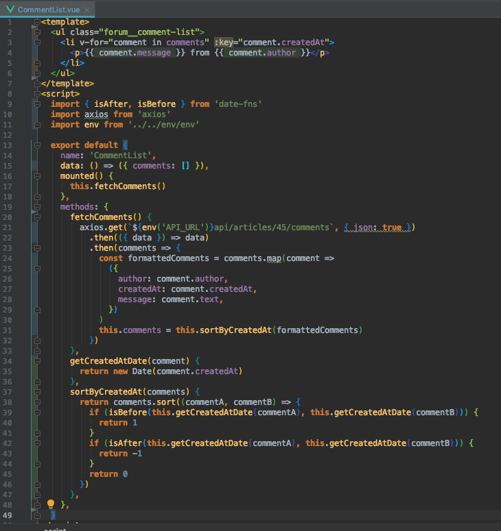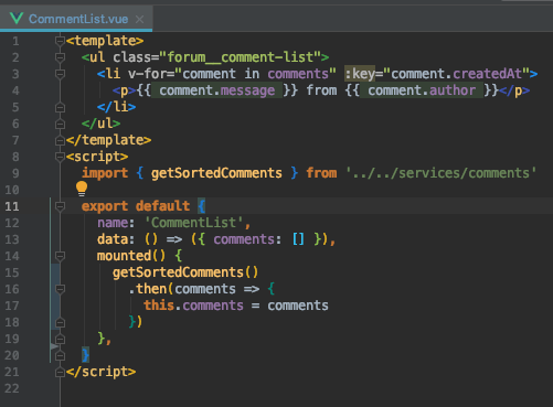 Dès qu’il est monté, le composant récupère la donnée. C’est le commentsService qui lui fournit celle-ci. Puis les commentaires sont affichés dans le template. Simple !