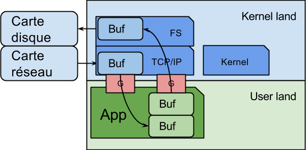 La carte réseau reçoit un paquet. Il est gardé dans un tampon dans la carte ou directement écrit dans une zone mémoire dédiée du kernel (en DMA), et une interruption est déclenchée sur le processeur. Un code du noyau se charge de traiter cette interruption pour récupérer le paquet réseau dans sa mémoire. Puis le tampon est recopié dans une zone mémoire de l’espace utilisateur pour qu’il puisse consulter les données. L’application peut alors lire les données du réseau, produire d’autres paquets avant d’en informer le kernel. Ce dernier duplique la mémoire de l’espace utilisateur vers un tampon de l’espace mémoire du noyau, et demande à la carte réseau de se charger d’envoyer le paquet sur le réseau.