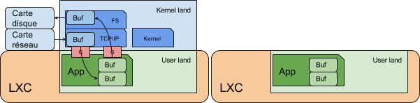 Une autre approche pour éviter les copies, de réduire le code dans l’OS et mieux contrôler les flux réseaux, consiste à proposer une nouvelle stack IP s’exécutant en espace utilisateur. Pour cela, il faut réserver des zones mémoires dans l’OS à des adresses fixes, et manipuler le driver des cartes réseaux pour lui indiquer où déposer les paquets manipulés sur le réseau.