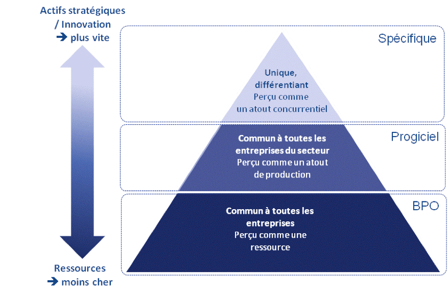 Evidemment non, par pour tout. Le progiciel reste souvent pertinent : par exemple, il ne viendrait aujourd’hui à l’idée de personne de redévelopper un système de paie pour ses besoins propres. Mais le développement spécifique est à envisager dans certains cas : quand l’outil informatique est une clé de réussite déterminante pour votre métier. La pyramide ci-dessous donne des orientations en termes de stratégie.