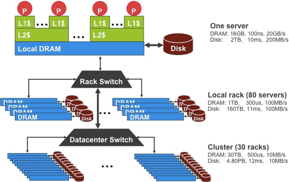 Les écarts sont ici de plusieurs ordres de grandeur (facteur 1000 en latence et débit sur la RAM) et concernent également les disques durs attachés de façon séparée à chaque machine. Par ailleurs, les équipements réseaux en entrée du système constituent un facteur limitant par rapport à la bande passante agrégée de toutes les machines. Les systèmes d’exploitation et les couches middleware traditionnelles ne prenant pas en charge de telles limitations, elles devront être traitées au niveau applicatif.
