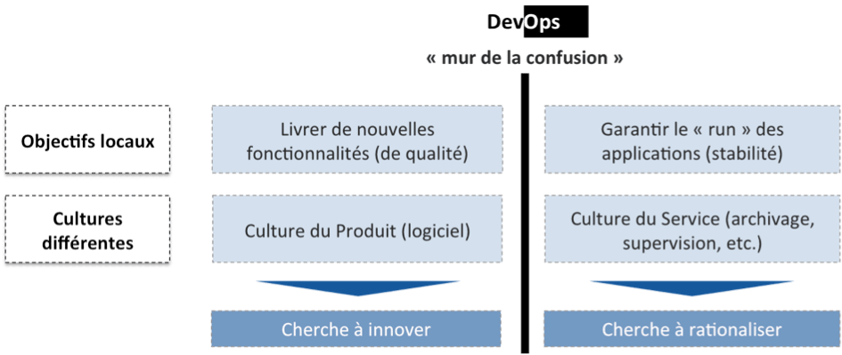 Le mouvement « DevOps » nous invite à repenser la frontière classique de nos organisations qui séparent d’un côté les études, i.e. ceux qui écrivent le code des applications (les « Dev ») et de l’autre côté la production, i.e. ceux qui déploient et exploitent ces applications (les « Ops »).