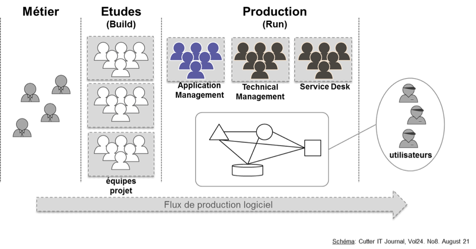 Les organisations classiques privilégient l’équipe projet. Dans ce modèle, les processus de déploiement, de supervision applicative et de gestion des datacenters sont répartis sur plusieurs organisations.