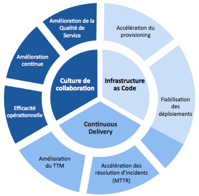 Devops s’organise autour de 3 piliers : « Infrastructure as code », « Continuous Delivery » et Organisation