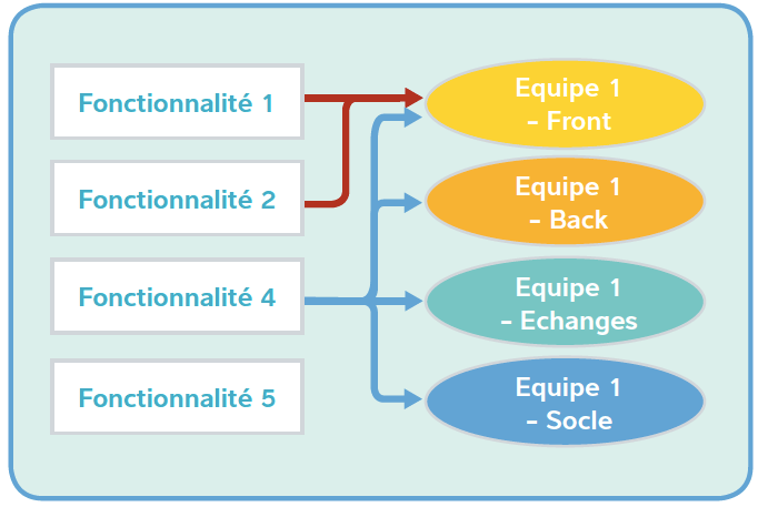 Les flèches rouges décrivent le premier problème. Les fonctionnalités les plus importantes (fonctionnalité 1) sur-sollicitent l’équipe Front. Les autres équipes doivent produire des choses marginales pour ces fonctionnalités. Malgré tout, on ne peut rien livrer tant que l’équipe 1 n’a pas fini. Les autres équipes, ne pouvant pas vraiment aider l’équipe 1 (car n’étant pas de la même spécialité), elles n’ont d’autre choix que de ne pas produire ou alors de faire du stock de fonctionnalités moins importantes (et le stock, en Lean, c’est mal…).