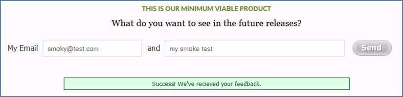 Le site theleanstartup.com, qui applique les principes qu’il défend (Pattern EYODF [4]) propose par exemple, tout en bas de sa page d’accueil (qui constitue le MVP de theleanstartup.com), un formulaire très simple, pour collecter les demandes de l’utilisateur, constitué de 2 champs : email et proposition de nouvelle fonctionnalité, accompagné d’une invitation : Que voulez-vous voir dans notre future version (du site) ?