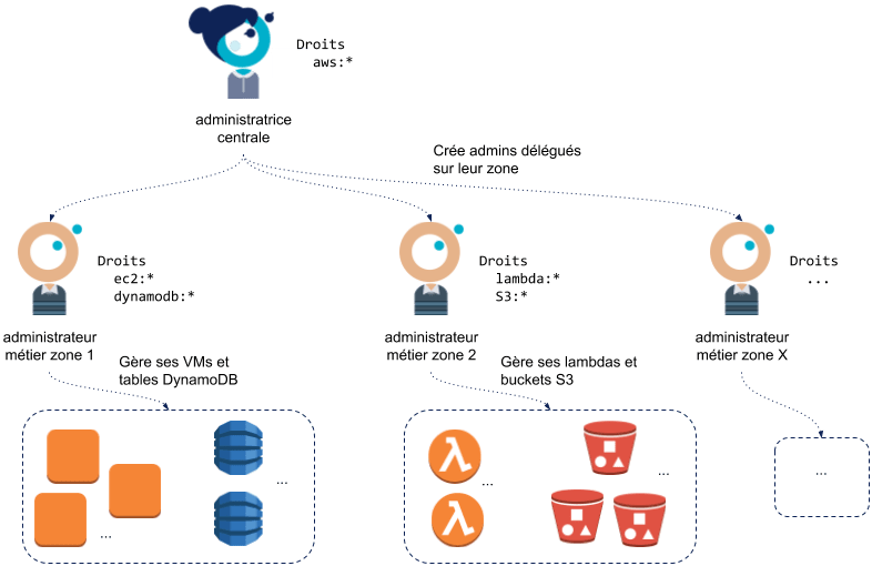 [caption id="attachment_77009" align="aligncenter" width="786"] Un administrateur central a tous les droits sur AWS, et peut délèguer des droits plus limités à des administrateurs métier