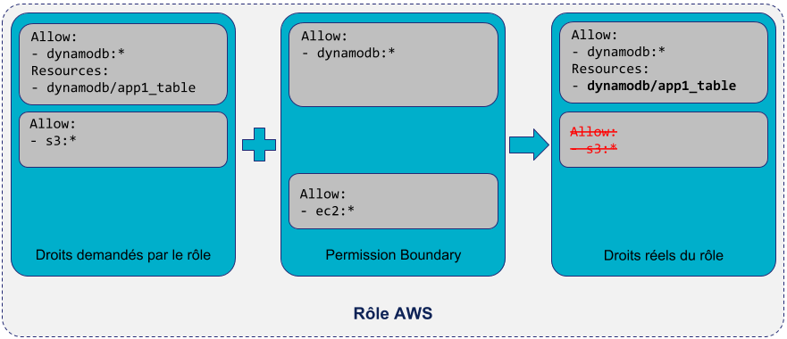 Dans la Figure 3, la Permissions Boundary n'inclut pas de droits S3 : bien que le rôle les ait demandés, il ne les aura pas. Inversement, la Boundary permettait toutes les actions sur DynamoDB et EC2, mais le rôle ne les a pas demandés : il ne les aura pas non plus ! La Boundary ne fait au mieux que supprimer des droits du rôle, sans en ajouter.