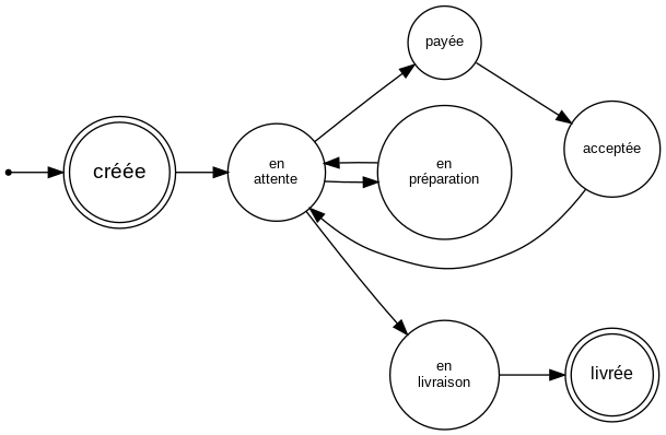 Lorsque l'on modélise nos processus, il arrive fréquemment qu'on tombe sur une modélisation dite d'automate fini. Ces modèles sont pratiques car faciles à visualiser et à décrire. Sans s'engager complètement dans leur formalisme, ils gardent un grand pouvoir explicatif. Par exemple, pour mon exemple de système de livraisons de commandes.