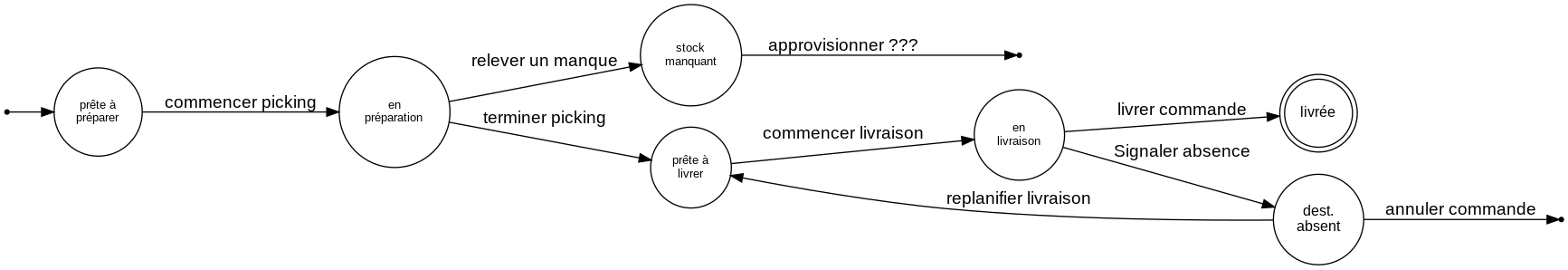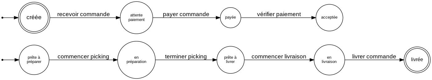 Ce diagramme indique le cycle de vie d'une commande dans un service de logistique une fois qu'elle est passée par un client. On y voit les temps d'attente entre les équipes qui préparent les commandes et celles qui les livrent. On y voit également quel état précède quel état, et donc quelles transitions sont légitimes.