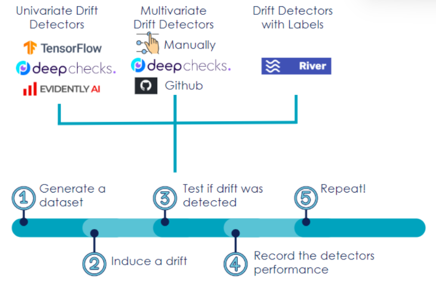 | Univariate Drift Detectors | Detects drifts by going through each feature and comparing the new batch distribution with the training distribution | 2-sample Kolmogorov-Smirnov Test [5] Wasserstein Distance [11] | Evidently AI DeepChecks Tensorflow Data Validation |