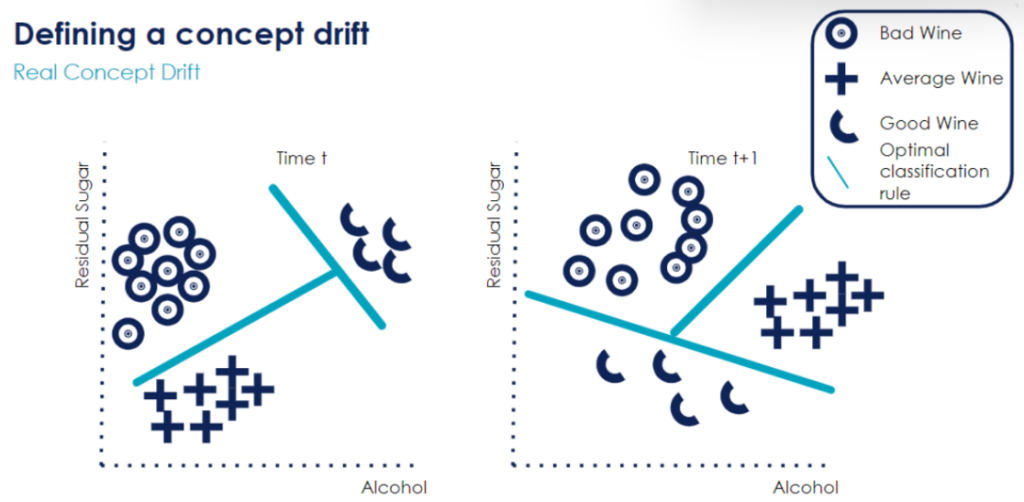 In contrast, real concept drifts disrupt the optimal classification rule: the relationship between the target variable and its predictors has changed. For instance, in the previous plot, data points classified as “Good Wine” had lots of sugar and alcohol. However, at time t+1, data points classified as “Good Wine” only have little sugar and alcohol. This shows a real concept drift because previously, we could see a positive correlation between the target variable “Quality” and its predictors “Residual Sugar” and “Alcohol”. Now, the correlation is negative: the less sugar and alcohol, the better the wine.