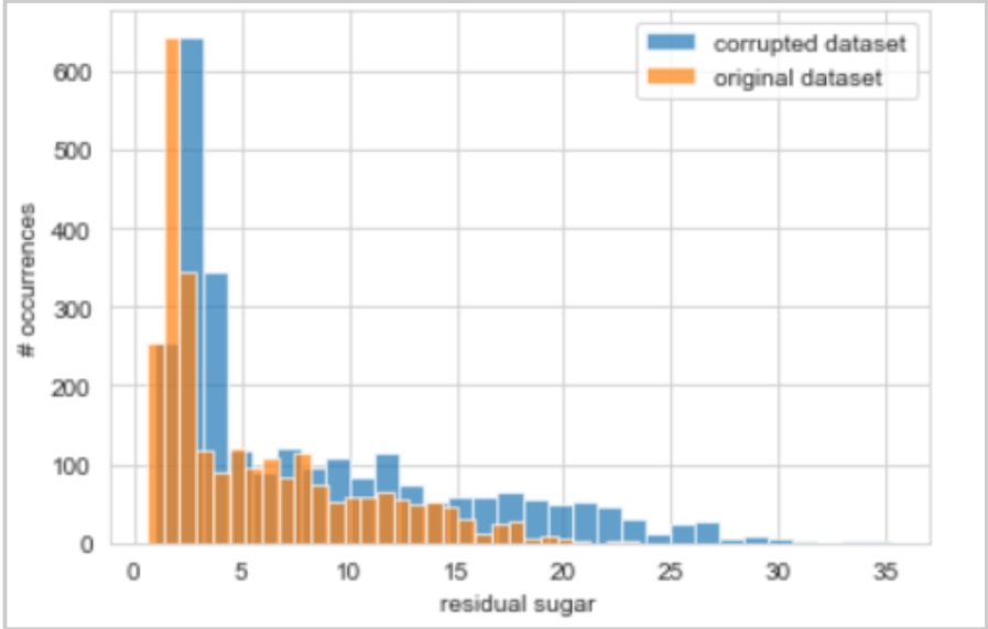 The below plot illustrates the values of the “residual sugar” column for both the original and corrupted dataset. Can you see how values have drifted?