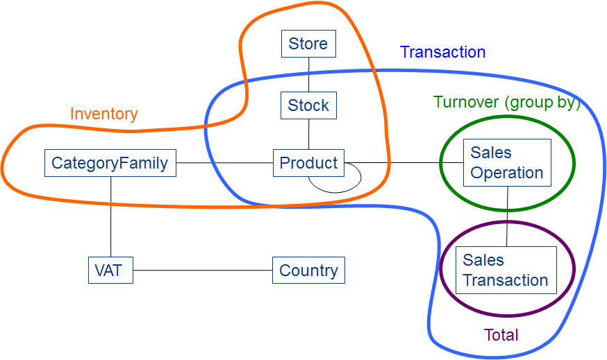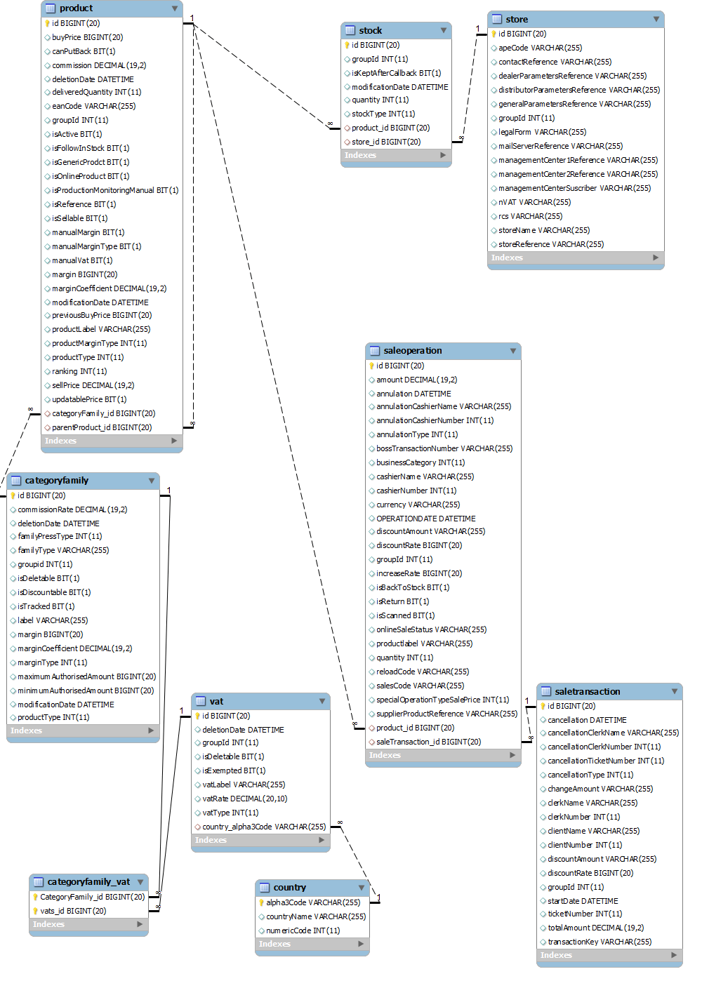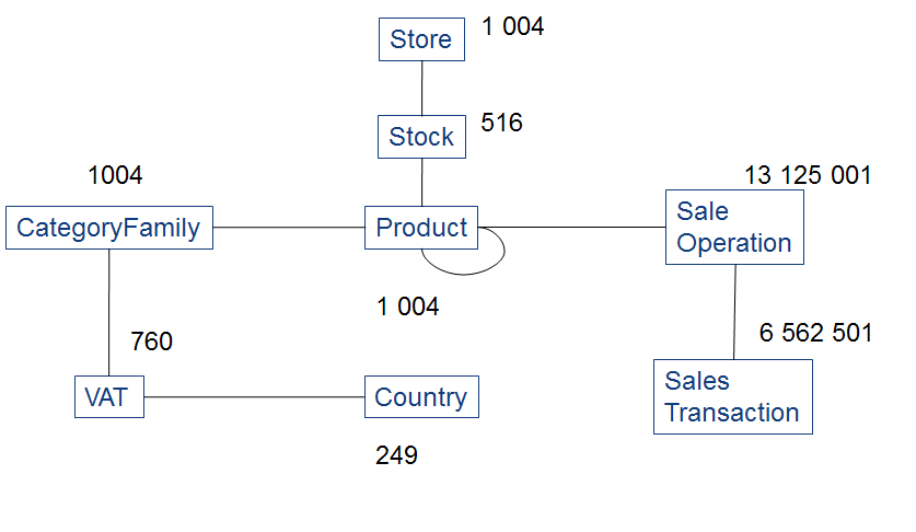 SaleOperation, the correspondingStockline is decremented and theSaleTransactiontotal is updated. This query goes along with another one not represented in this schema. This second query involvesCountryandCategoryFamilyandVATin order to identify the corresponding VAT rate to apply. - Total: the corresponding