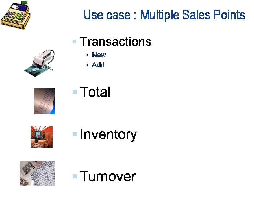 The hold use case is a sale application. One of our client had a scalability limit on such use case with its SGBDR. This application is multi-country and multi-Point of Sale. Each point of sale owns its stock which is updated during each transaction. Currency conversion, Value Added Taxes are computed by the application according to country specific parameters. Each sale operation is recorded and grouped in a sale transaction at the end of which the customer will pay. The mental image of a supermarket cash desk is the easier way to keep in mind these concepts.