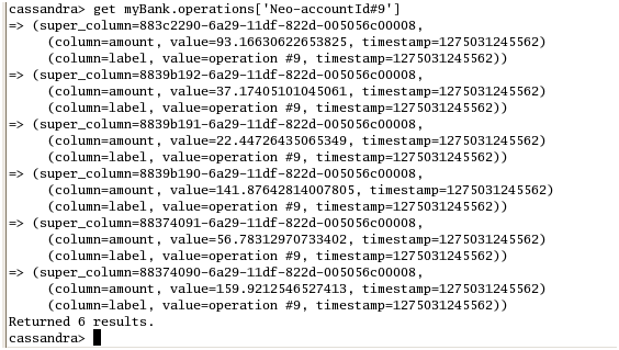 Thus: - The key is the account Id - The “Value” is a SuperColumn which stores all the operations for this account (the limitation of this model is the number of operations you could have…). Thus the operation is a list of columns (type, amount, date…) ordered by a time-based UUID inside the SuperColumn. The CompareWith tells Cassandra how to sort the columns (remember the column are sorted, within a row, by their name. In our examples, I want my operations (whose name is a time-based UUID) to be chronologically sorted. That's what I specify to Cassandra with the CompareWith attribute. The CompareSubcolumnsWith attribute will be responsible for sorting the Column included in the SuperColumn... Here is what you get using the Cassandra-cli tools /exit_resize.jpg)