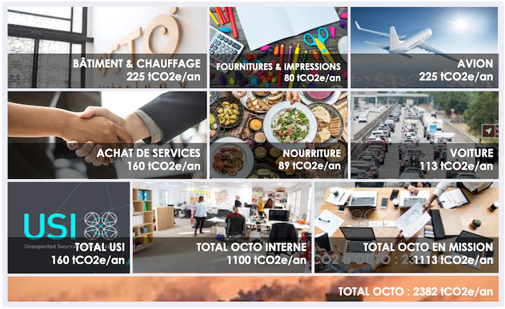 - Pour les plus attentifs d'entre vous, vous aurez noté que la somme des postes d'émissions fait plus que le total... C'est une question de périmètre, par exemple il y a des émissions liées aux avions dans le bilan carbone de l'USI et dans celui du fonctionnement interne d'OCTO, les premières cases ne sont pas la décomposition mutuellement exclusive du total... Et nous n'avons pas fait apparaître le bilan carbone de la Duck Conf, il manque donc 10 tCO2e, bref c'est une synthèse et il lui manque la précision.
