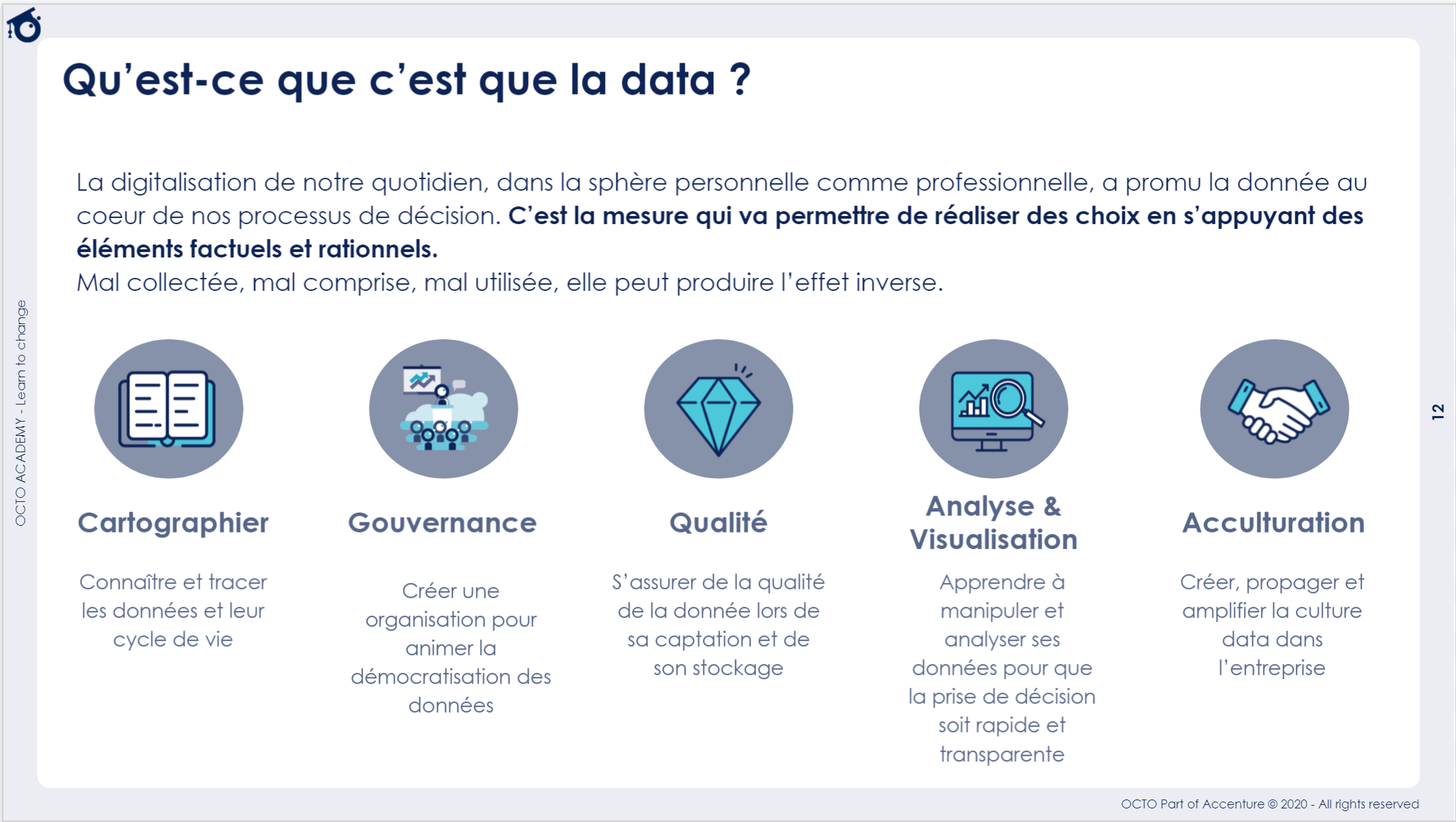 - Gouvernance : créer une organisation et pouvoir animer une communauté autour des données pour les mettre au centre de l'entreprise.