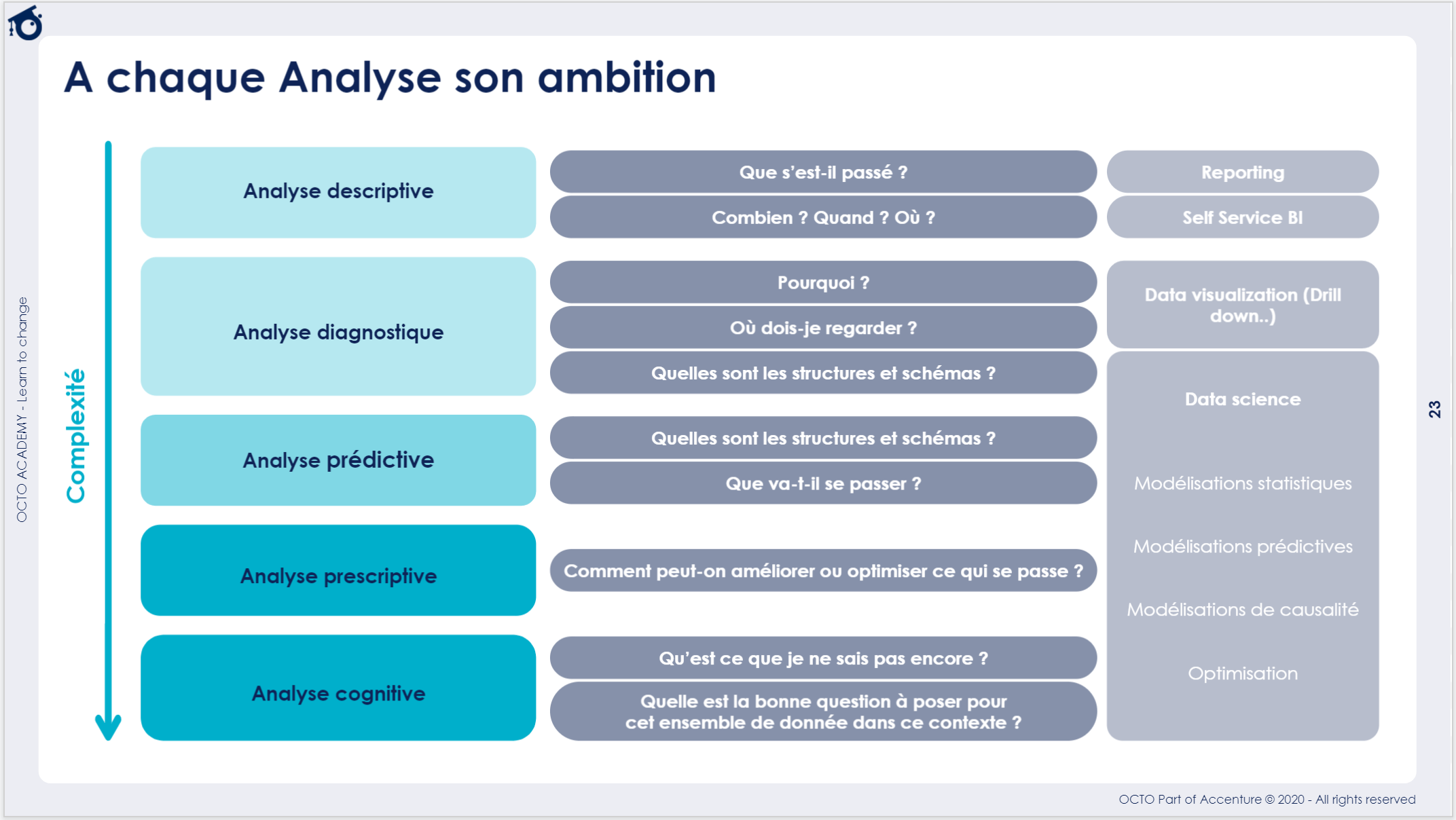 Pour pouvoir représenter et utiliser la donnée, il est possible de s’appuyer sur différents types d'analyses en fonction de l’objectif recherché. A chaque analyse son ambition. On part de l'analyse descriptive simple qui va décrire ce qui s'est passé (combien ? quand ? où ?) et permettre de restituer les données via des reportings ou du self-service Business Intelligence jusqu’à l'analyse cognitive en passant par le prédictif et le prescriptif. Les rôles aussi évoluent en fonction du niveau d’analyse : on commence avec le data visualiseur et on termine avec le data scientist qui va appliquer des méthodes de modélisation statistique prédictive, de causalité.