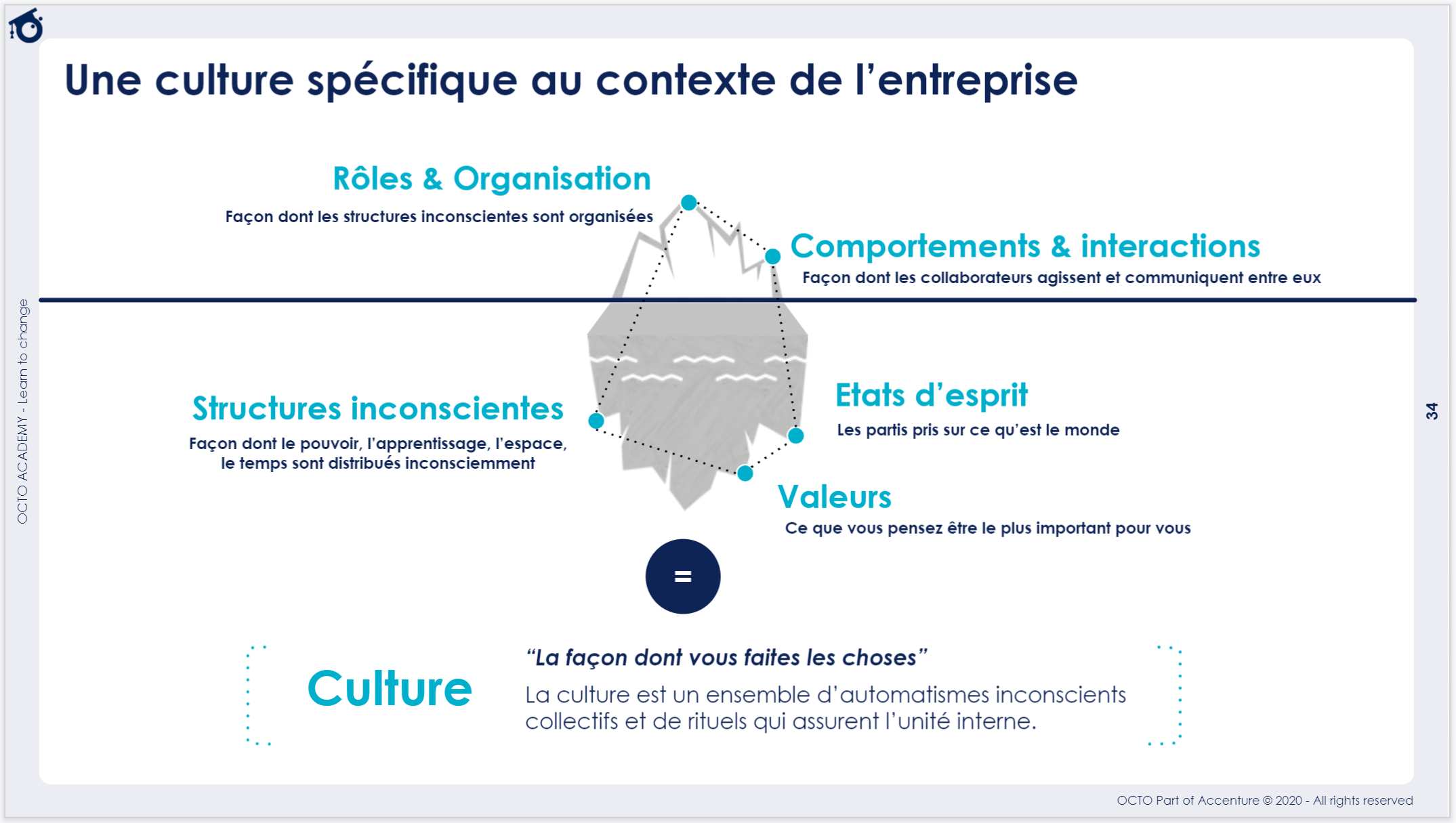 Les organisations doivent favoriser l’émergence de pratiques qui encouragent à l'utilisation des données avec un fort soutien à l'utilisation d’éléments factuels dans la prise de décision. Pour pouvoir mettre en place cette acculturation au sein de l'entreprise, nous pouvons reprendre l’image de l’iceberg. Il y a la partie visible, qui se modifie assez rapidement et puis il y a une partie qui est vraiment plus profonde et qui est difficile à faire évoluer.