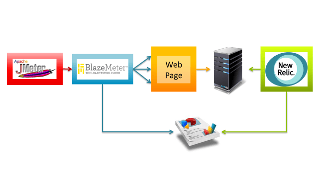 JMeter is the most widely used tool for creating and executing load testing scripts in the opensource world. Whereas the scenarios will be created in the JMeter, the best choice in terms of integration and execution of these scripts in the cloud is without a doubt the BlazeMeter, which in turn, in addition to rich reports in detail even offers integration with New Relic, which as a "detective" will be responsible for the monitoring of data and application servers, increasing the graphs and reports with data from the server hardware utilization.
