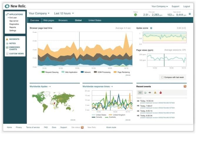É uma solução SaaS que permite monitorar aplicações Web. A idéia é bem simples, existe um agente que coleta os dados de performance e envia isto assincronamente para um servidor da New Relic, exibindo assim uma espécie de raio-x sua aplicação, com informações de CPU, memória, tempo de resposta, throughtput, número de requisições, erros, transações mais lentas, uso do banco de dados, jvm em real time.